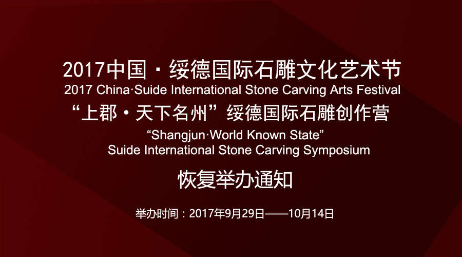 2017年 7月26日,陕西绥德县发生百年不遇特大洪涝灾害,损失惨重。由于灾情万分紧急,榆林市委市政府集中各方力量深入灾情一线抢险救灾防疫。截至目前,重建工作初见成效。原定于2017年8月11日——8月25日在陕西绥德县举行的2017中国·绥德国际石雕文化艺术节、 “上郡•天下名州”绥德国际石雕创作营,改期到2017年9月29日——10月14日举行。特此通知。